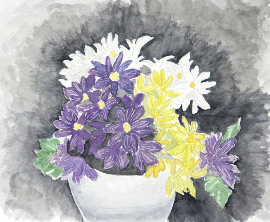 That day happened to be our wedding anniversary so I decided to paint some flowers we have that are in our wedding colors. It wasn’t finished that day, but it is now.